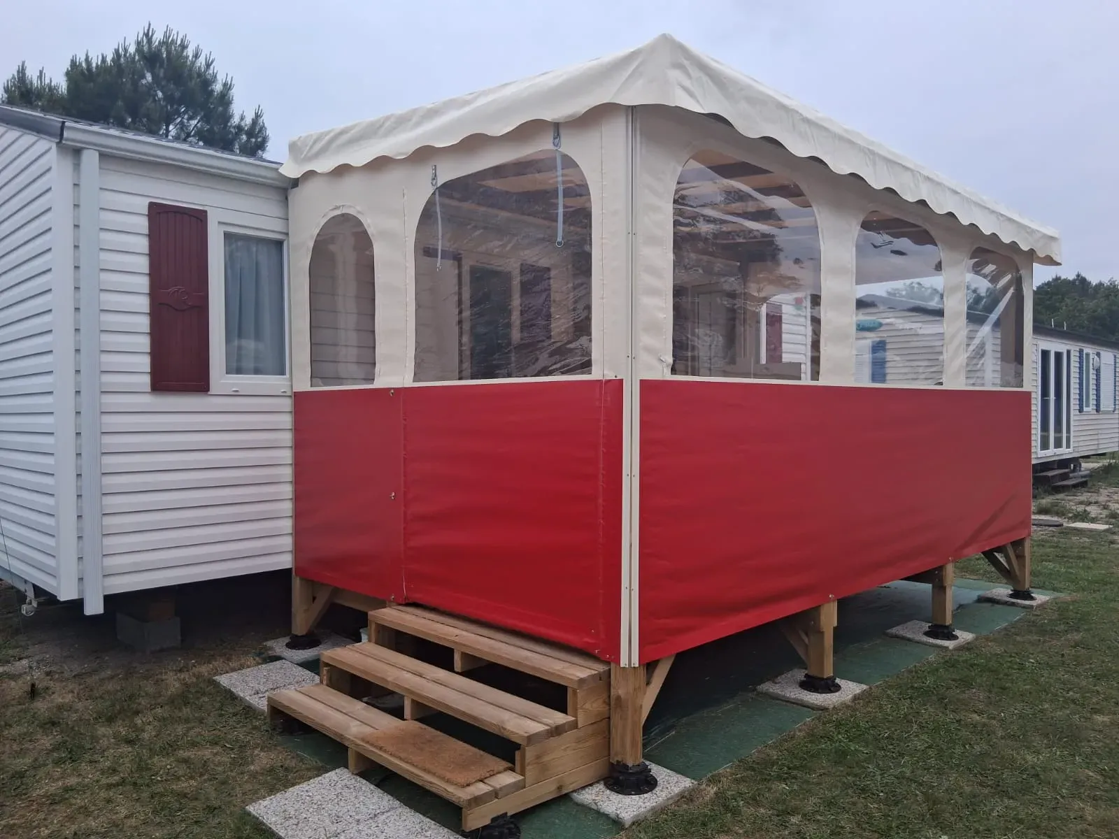Une bâche plate avec une retombée sur l’avant, l’arrière et les côtés, d’une hauteur comprise entre 15 et 30 cm en général. Nous procédons à la soudure de patchs anti-tempête au niveau de vos lambourdes, ainsi qu’à la pose d’une bande d’œillets sertis tous les 40 cm pour un tressage avec Sandow, garantissant un maintien total de votre bâche.